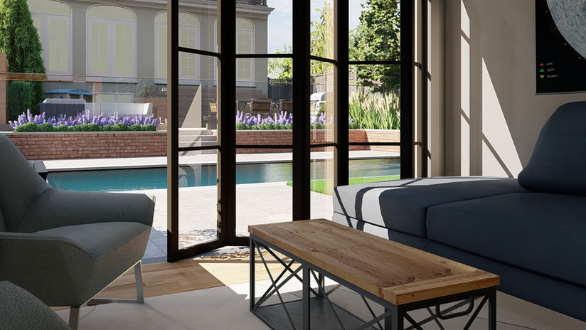 Renderings of proposed backyard design plan for in-ground swimming pool and reconfigure existing garage into indoor/outdoor living space